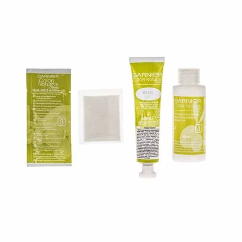 کیت رنگ مو گارنیر شماره 4.15 به رنگ قهوه ای جذاب بوده و یک گزینه ی کاملا ایده آل برا خانم های با سلیقه ی خاص می باشد. از مهمترین مزیت های این محصول می توان به ترکیبات فاقد آمونیاک آن اشاره نمود که بدون آسیب به ساختار مو رنگ دلخواه شما را در منزل ایجاد می کند. 3 روغن مغذی زیتون، آووکادو و شی باتر تاثیر شگرفی در تقویت و تغذیه ی موها از ریشه تا نوک خواهد داشت.با استفاده از این ترکیبات معجزه آسا پس از رنگ آمیزی با موهای خشک و وز خداحافظی کنید چرا که موهایی کاملا ابریشمی و نرم به ارمغان خواهد آورد. ماندگاری این رنگ طولانی مدت بوده و تا 8 هفته می باشد. قدرت پوشش دهی 100 درصدی موهای سفید را داشته و سبب آسیب به تارهای نازک مو نمی شود و به اصلاح موها را نمی سوزاند. در داخل جعبه محصولاتی وجود دارد که به طور کامل شما را رفتن به سالن های زیبایی معاف می کند. این محصولات شامل 40 میل رنگ تیوپی، 60 میل اکسیدان، ماسک مو، دفترچه ی راهنما و یک جفت دستکش می باشد. رنگ قهوه ای گارنیر استفاده ی آسانی داشته و با نفوذ به عمق موها رنگ را درون رشته های مو قفل می کند.